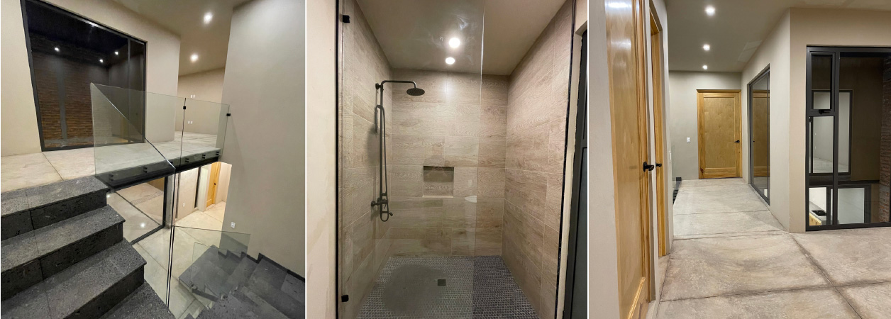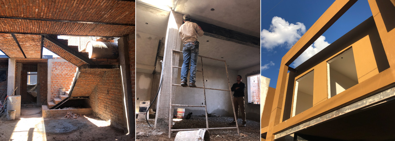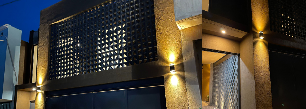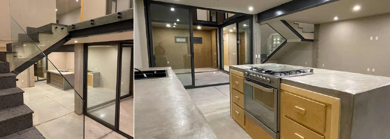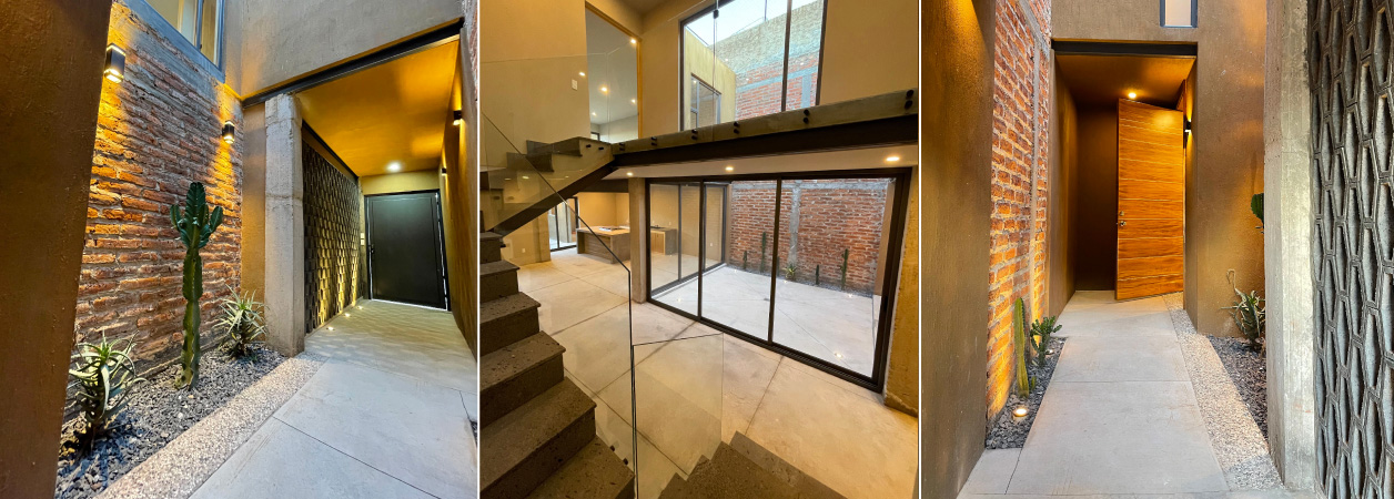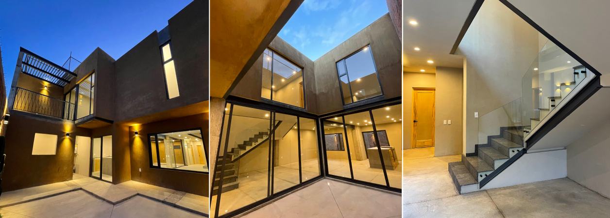 destacando acabados como el concreto aparente, el concreto pulido, el ladrillo, el recinto, el estuco y el color terracota para darle calidez al conjunto. La iluminación destaca en este proyecto en el que se creó un patio central o cubo de luz natural en el que esta penetra y transita mágicamente por el espacio y se refleja sobre sus superficies pulidas, exaltando los materiales y unificando todas las áreas de la casa. La escasez de adornos, la simpleza de los acabados y el selecto número de objetos funcionales le confieren a este hogar un aire de serenidad de alto carácter estético.