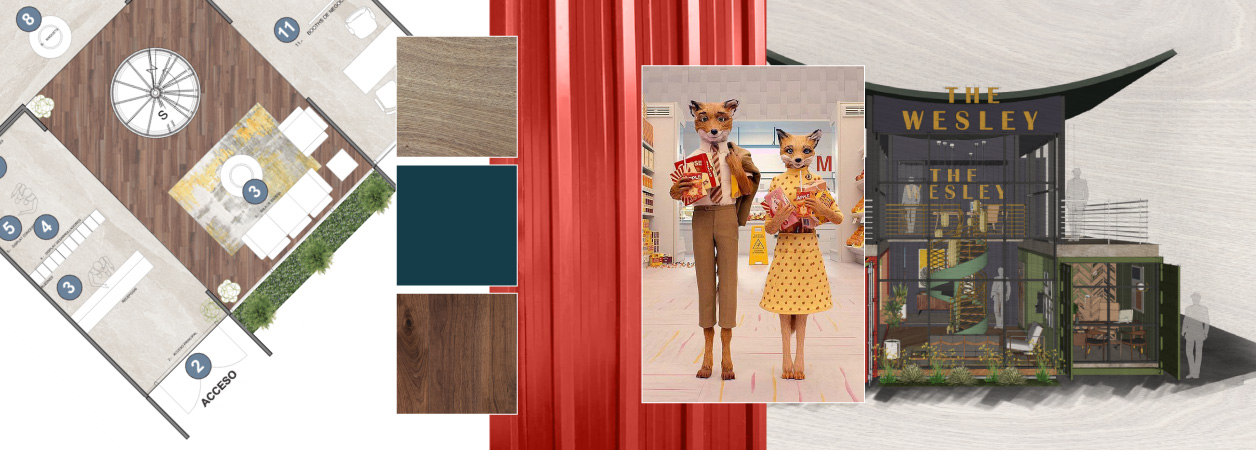 Algo que provoca que un sitio se sienta audaz y vibrante es la inclusión de elementos sorpresivos, por ello en The Wesley tomaron como inspiración la filmografía de Wes Anderson. Este complejo habitacional de edificación vertical orientado a un público joven con una rutina urbana, dinámica y divertida requería unas oficinas de ventas que reflejaran todo este concepto, así que
